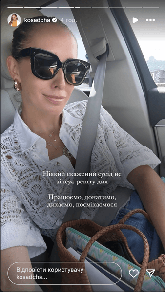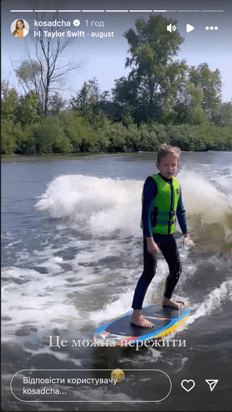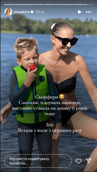 Впоследствии Катя Осадчая показалась в авто и отметила, что "никакой бешеный сосед не испортит остаток дня". В понедельник они с сыном Иваном катались на серфе.