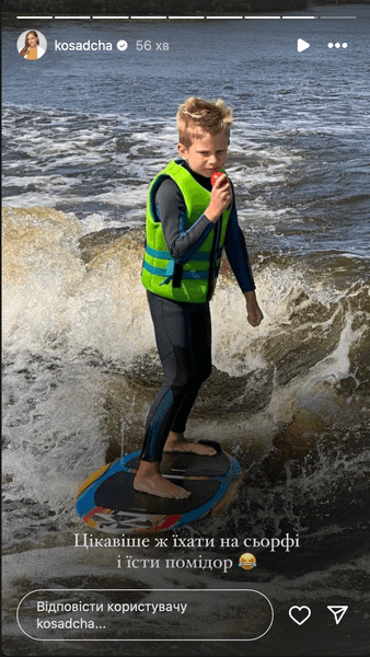 "Интереснее же ехать на серфе и есть помидор", — пошутила мама троих детей, показав фото старшего сына от Юрия Горбунова.