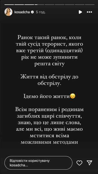 "Они пытаются нас запугать, уничтожить нашу инфраструктуру, нашу жизнь. Но как они не могут понять одного — с каждым таким разом мы становимся все сильнее, а наша ненависть еще больше… Мы должны держаться вместе. Верить. Помогать", — обратился к подписчикам кулинар.