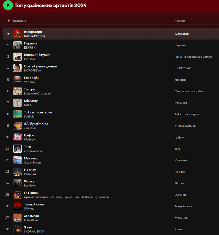 Spotify назвал самых прослушиваемых украинских артистов 2024 года и топ-треки