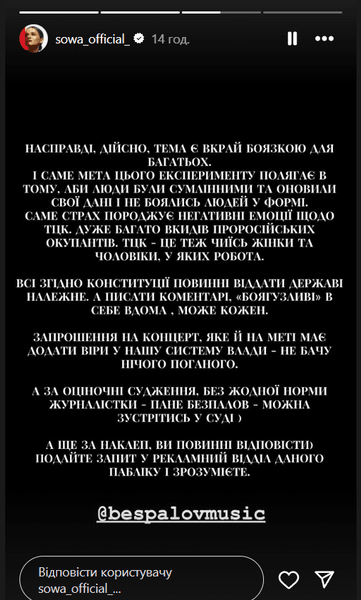 Впоследствии певица прокомментировала критику в свой адрес. Она отметила, что ее видео не имело целью оскорбить или вызвать негативные эмоции, а наоборот, было направлено на повышение осведомленности среди граждан. SOWA объяснила, что ее цель заключалась в том, чтобы люди стали более добросовестными, обновляли свои данные в ТЦК и не боялись представителей военкоматов. Певица также добавила, что видео имело целью поднять доверие к государственным структурам.