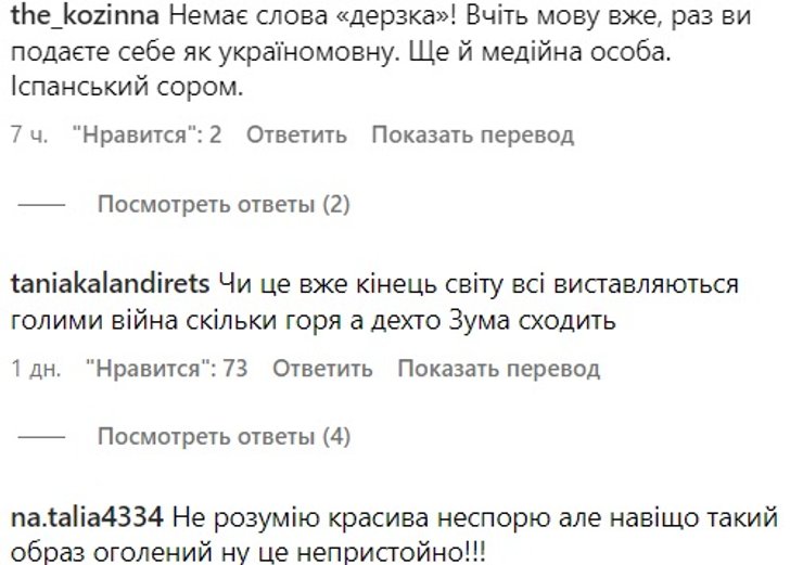 "Не понимаю, красивая, не спорю, но зачем такой образ обнаженный, ну это неприлично!", "Или это конец света, все выставляются голыми, война сколько горя, а некоторые с ума сходят", – возмущаются другие.