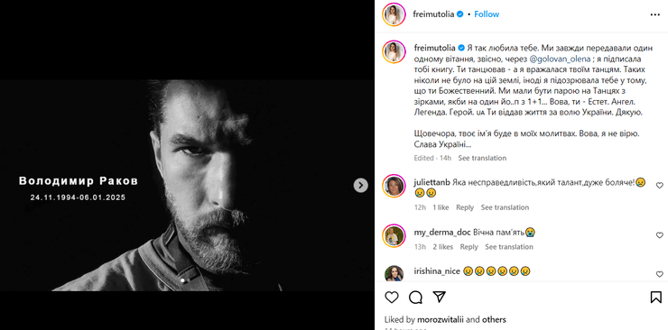 "Мы всегда передавали друг другу поздравления, конечно, через @golovan_olena; я подписала тебе книгу. Ты танцевал – а я поражалась твоим танцам. Таких никогда не было на этой земле, иногда я подозревала тебя в том, что ты Божественен. Мы должны были быть парой на Танцах со звездами, если бы на один его..п из 1+1… Вова, ты — Эстет. Ангел. Легенда. Герой. 🇺🇦 Ты отдал жизнь за свободу Украины. Спасибо", – говорится в публикации.