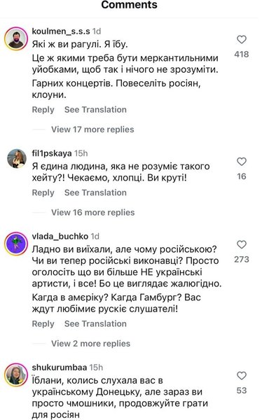 "Завершающим штрихом будет поехать с вашим русскоязычным контентом в Москву. Желательно там и остаться… Когда-то очень сильно вас любила. Но сейчас вы просто жалкие. Жаль видеть как когда-то кумиры превращаются в де***мо", — указывают подписчики.