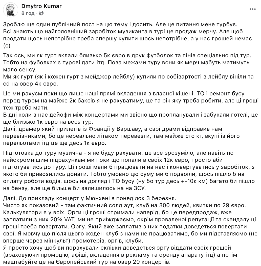 Музыкант отметил, что ему жаль всех, кто вложил силы в тур, и слушателей, которые уже успели купить билеты. Также он выразил сожаление, что не привезет вовремя заработок с благотворительного тура, который должен был потратить на тактическую медицину, и уточнил, что речь идет о примерно миллионе гривен.