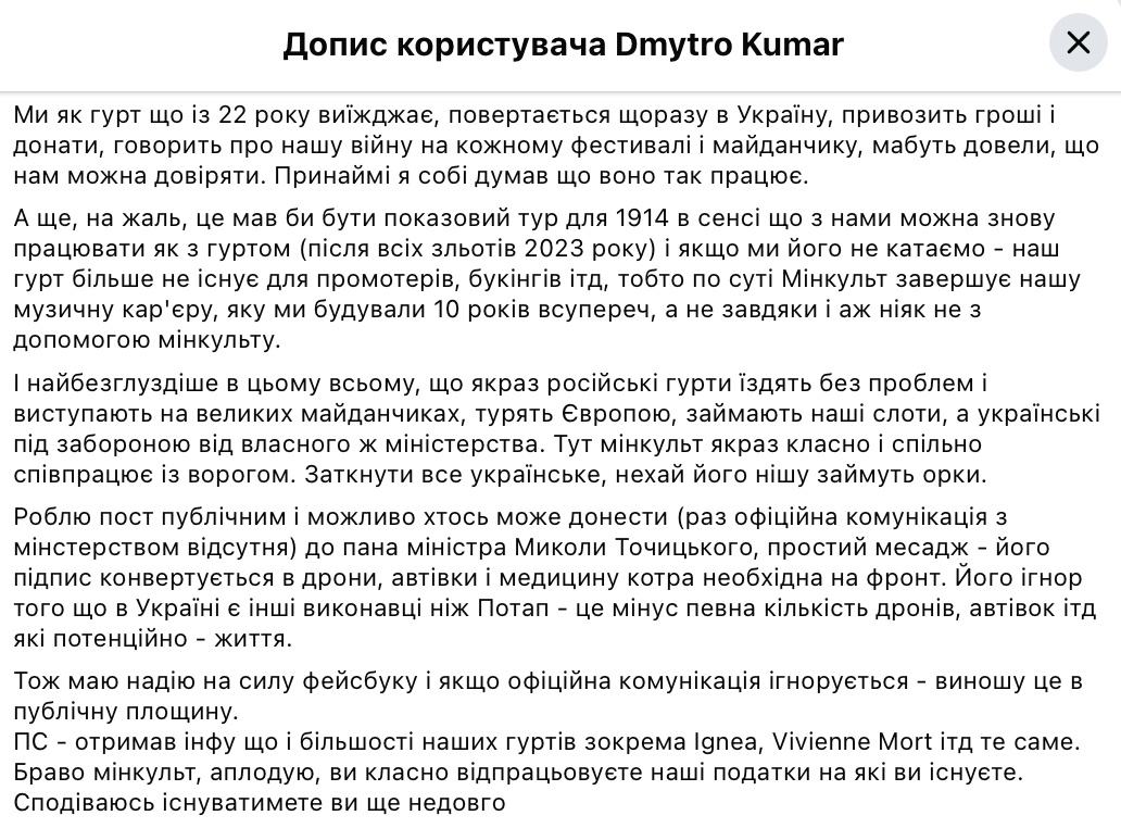Он поделился, что для него, человека с онкологией, "дело жизни — это все". Кроме того, выступления давали возможность артисту помогать армии и распространять украинские нарративы. Он подчеркнул, что группа должна была за три года полномасштабной войны подтвердить доверие, однако в случае отмены тура его больше не будет существовать для промоутеров, организаторов и тому подобное.