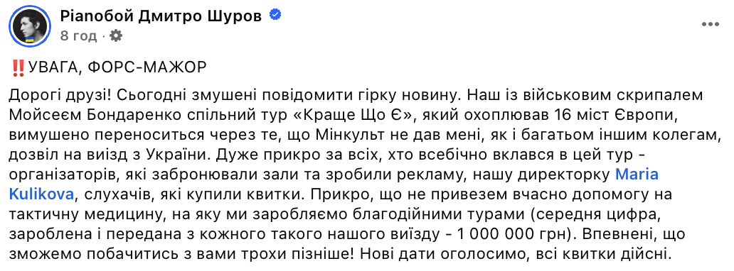 "Сегодня вынуждены сообщить горькую новость. Наш с военным скрипачом Моисеем Бондаренко совместный тур "Лучше Что Есть", который охватывал 16 городов Европы, вынужденно переносится из-за того, что Минкульт не дал мне, как и многим другим коллегам, разрешение на выезд из Украины", — сообщил он.