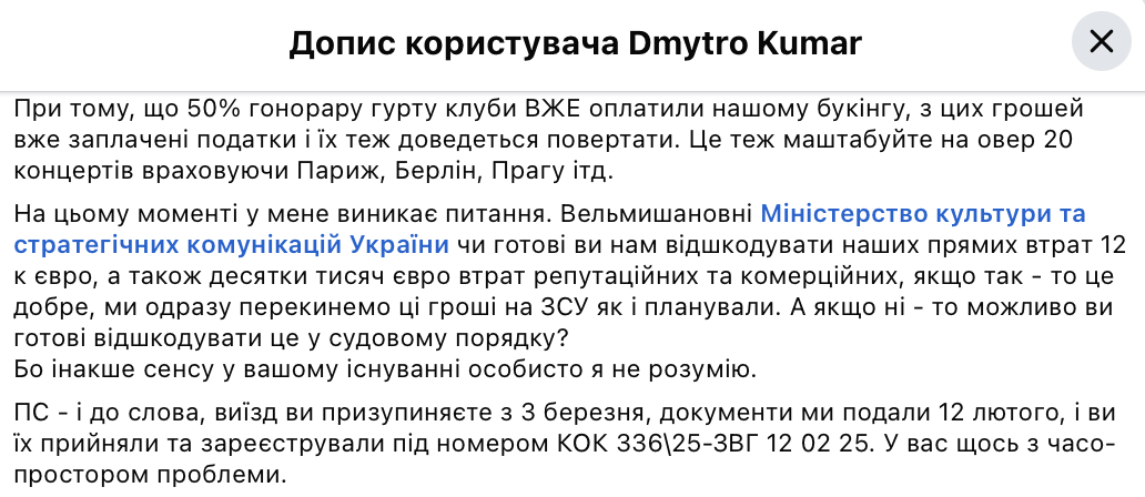 "Многоуважаемые Министерство культуры и стратегических коммуникаций Украины, готовы ли вы нам возместить наших прямых потерь 12 к евро, а также десятки тысяч евро потерь репутационных и коммерческих, если да — то это хорошо, мы сразу перебросим эти деньги на ВСУ как и планировали. А если нет — то возможно вы готовы возместить это в судебном порядке?", — заявил Кумар.
