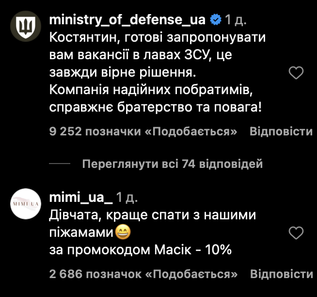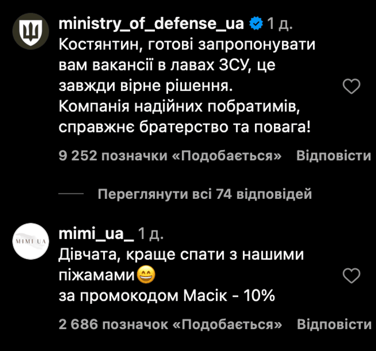 Вместе с магазинами в комментарии к посту жены бизнесмена Дарьи Валеулиной "пришло" Министерство обороны Украины.