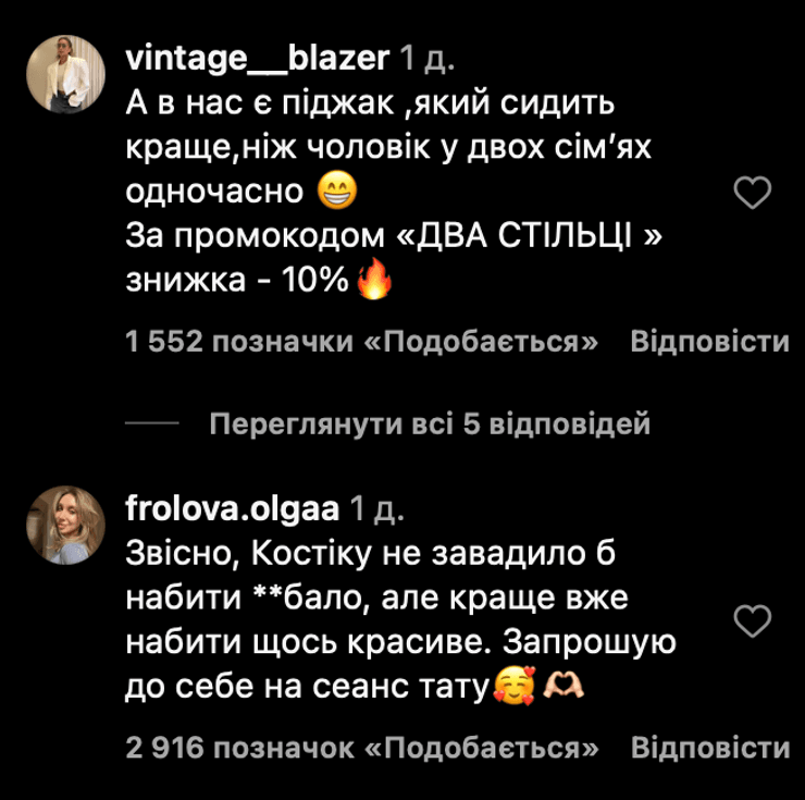 Также украинские креативные предприниматели дали промокод "два стула" для покупки пиджака, который "сидит лучше, чем мужчина в двух семьях одновременно".