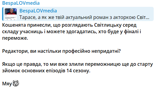 На этом утечка информации не прекратилась. Телеграмм-канал "Злива" опубликовал не только косвенно подтвердил слова Беспалова, но и обнародовал информацию о гонораре Тараса Цимбалюка за участие в шоу со ссылкой на некий "техотдел".