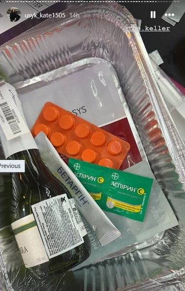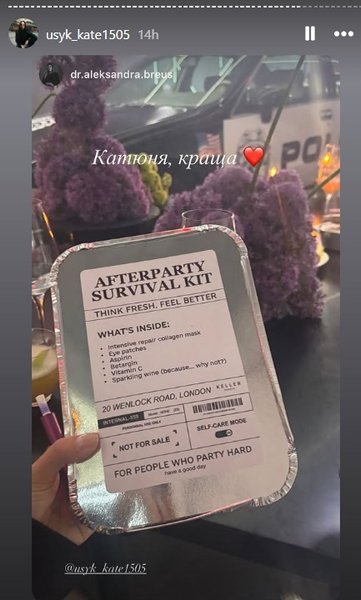 Гости с вечеринки уехали не с пустыми руками, а с "наборами для выживания". Внутри бокса были маска для лица, патчи под глаза, блистер аспирина, упаковка бетаргина, витамин С, а также маленькая бутылочка шампанского.