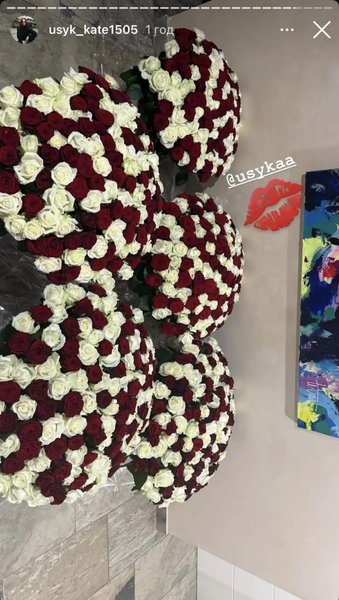 На записях не видно супруга Катерины, однако она поделилась фото подарка от него, показав пять огромных букетов роз, красных и белых.