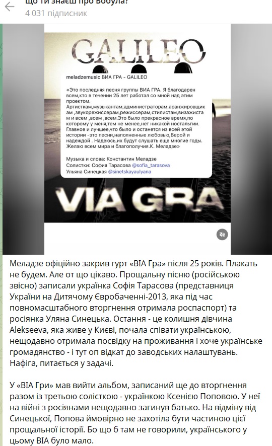 "Это последняя песня группы ВИА ГРА. Я благодарен всем, кто в течение 25 лет работал со мной над этим проектом. Артисткам, музыкантам, администраторам, аранжировщикам, звукорежиссерам, режиссерам, стилистам, визажистам и всем, всем, всем. Это было прекрасное время, по которому у меня, тем не менее, нет никакой ностальгии. Главное и лучшее, что было и останется из всей этой истории – это песни, наполненные любовью, Верой и надеждой. Надеюсь, их будут слушать еще многие годы. Желаю всем мира и благополучия. К. Меладзе", – говорится в подписи.