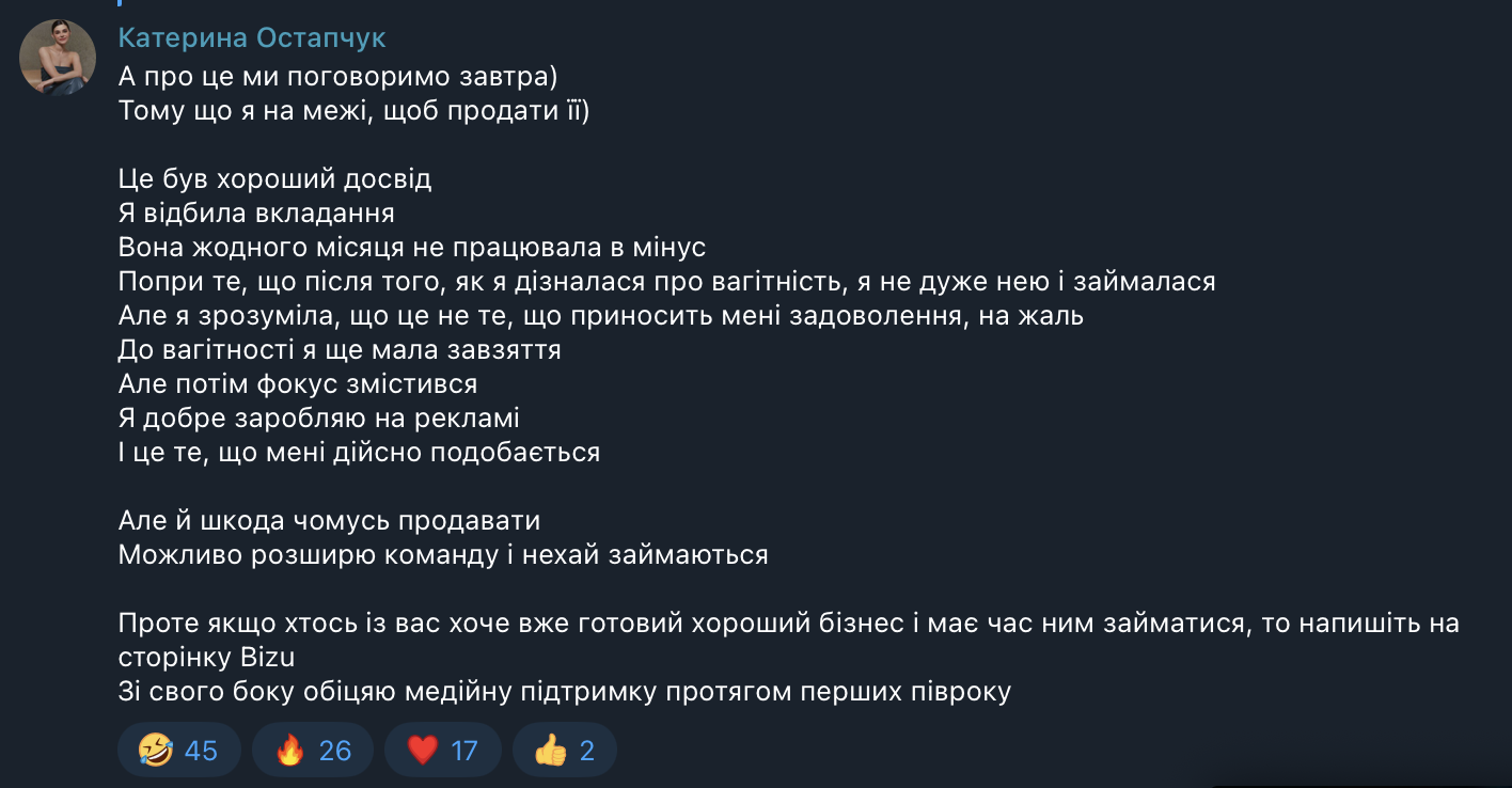 Екатерина Остапчук продает бизнес