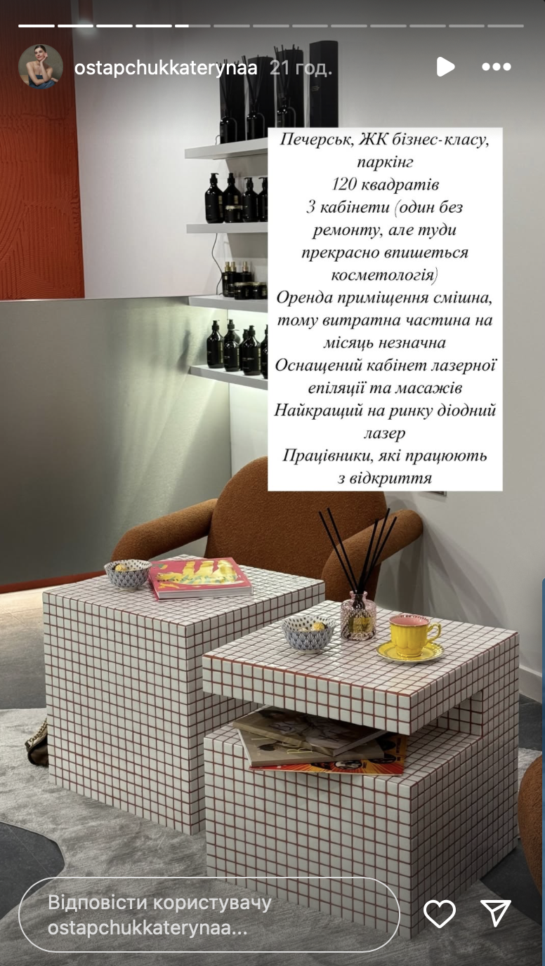 Екатерина Остапчук, блогерша и жена ведущего Владимира Остапчука, объявила о продаже собственного бизнеса в центре Киева за почти три миллиона гривен. Речь о студии массажа и лазерной эпиляции.