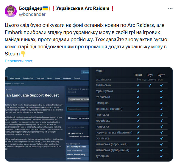 "У нас есть два официальных локализационных агентства, которые могут перевести ARC Raiders на украинский язык: SBT Localization (один из их последних проектов — Baldur's Gate 3) и UnlocTeam (они имеют опыт перевода онлайн-игр, таких как Waframe). Мы, украинские геймеры, будем рады и очень благодарны за возможность играть в ARC Raiders на родном языке!", — подчеркнул он.