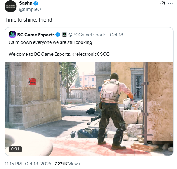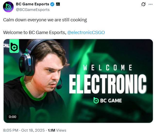 "Добро пожаловать в BC Game Esports, @electronicCSGO (ник россиянина Шарипова в сети X — ред.)", — говорится в заметке.