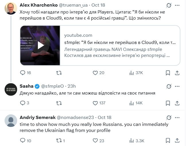 Сообщение Костылева вызвало бурную реакцию у пользователей. Возмущение вызвало в частности то, что Александр S1mple в 2024 году заявлял о том, что никогда бы не перешел в команду Cloud9 из-за того, что там есть четыре игрока из России. О его предыдущих заявлениях Александру напомнили в комментариях к сообщению.