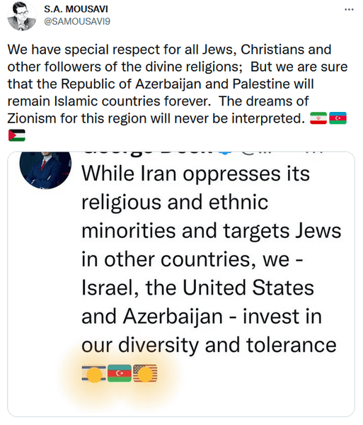 "Мы с особым уважением относимся ко всем евреям, христианам и другим последователям божественных религий; Но мы уверены, что Азербайджанская Республика и Палестина навсегда останутся исламскими странами. Мечты сионизма об этом регионе никогда не будут истолкованы", — заявил Мусави.