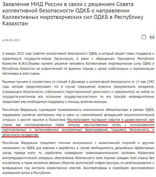 В заявлении указывается, что решение ввести войска в Казахстан принято на основе 4 статьи Договора о коллективной безопасности от 15 мая 1992 года. Россия подтверждает свою приверженность коллективной безопасности, поэтому незамедлительно предоставит необходимую помощь, включая военную.