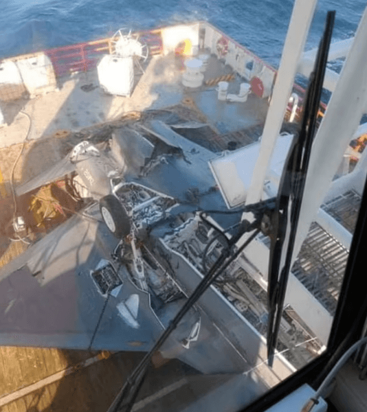 На фотографии видно, как F-35 лежит "на спине" на судне с выпущенным шасси и открытым отсеком для оружия. Носовая часть фюзеляжа с кабиной пилота не видна.