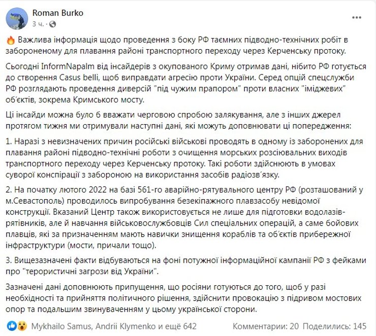 "Российские военные проводят работы по очистке морских рассеивающих выходов транспортного перехода через Керченский пролив. Такие работы проводятся в условиях строгой конспирации с запретом на использование средств радиосвязи", – сообщил Бурко.