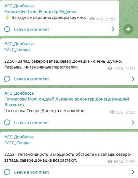 "На окраинах Донецка идет бой. 22.52 — интенсивность и мощность обстрела на западе, северо-западе, севере Донецка возрастают. Очевидцы сообщают об усилившемся обстреле окраин Донецка", – пишут на ресурсах.