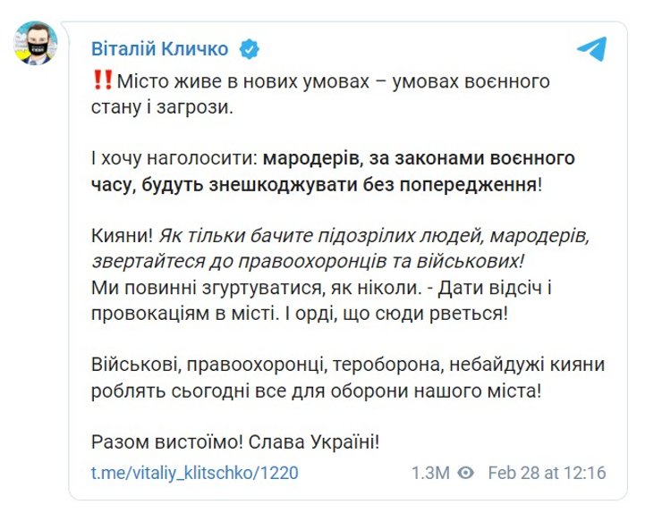 "Город живет в новых условиях – условиях военного положения и угрозы. И хочу подчеркнуть: мародеров, по законам военного времени, будут обезвреживать без предупреждения! Киевляне! Как только видите подозрительных людей, мародеров, обращайтесь к правоохранителям и военным! Мы должны сплотиться, как никогда. — дать отпор и провокациям в городе. И орде, что сюда рвется! Военные, стражи порядка, тероборона, неравнодушные киевляне делают сегодня все для обороны нашего города! Вместе выстоим! Слава Украине! ", – написал он в своем телеграмм-канале.