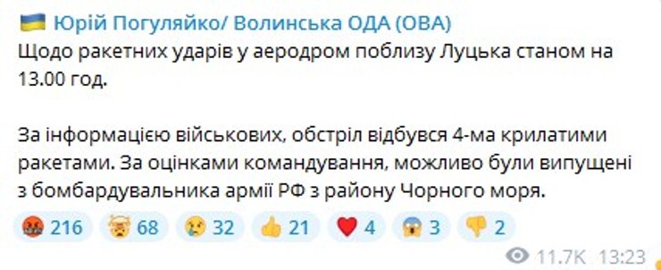 Военный аэродром в Луцке обстреляли четырьмя крылатыми ракетами, заявил глава Волынской областной военной администрации (ОВА) Юрий Погуляйко.