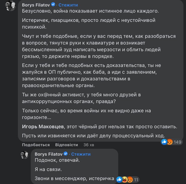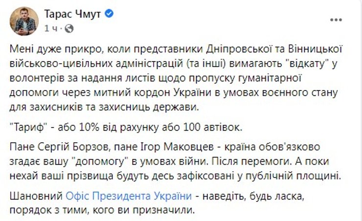 "Тариф" – или 10% от счета или 100 автомобилей. Господин Борзов, господин Маковцев – страна обязательно вспомнит вашу "помощь" в условиях войны. После победы. А пока пусть ваши фамилии будут где-нибудь зафиксированы в публичной плоскости", – написал Чмут.