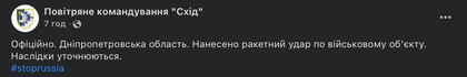 "Официально. Днепропетровская область. Нанесен ракетный удар по военному объекту. Последствия уточняются", — сказано в посте.