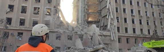 Выяснилось, что в результате атаки здания ВС РФ разрушена его центральная секция — с 9 по 1 этаж, без последующего горения.