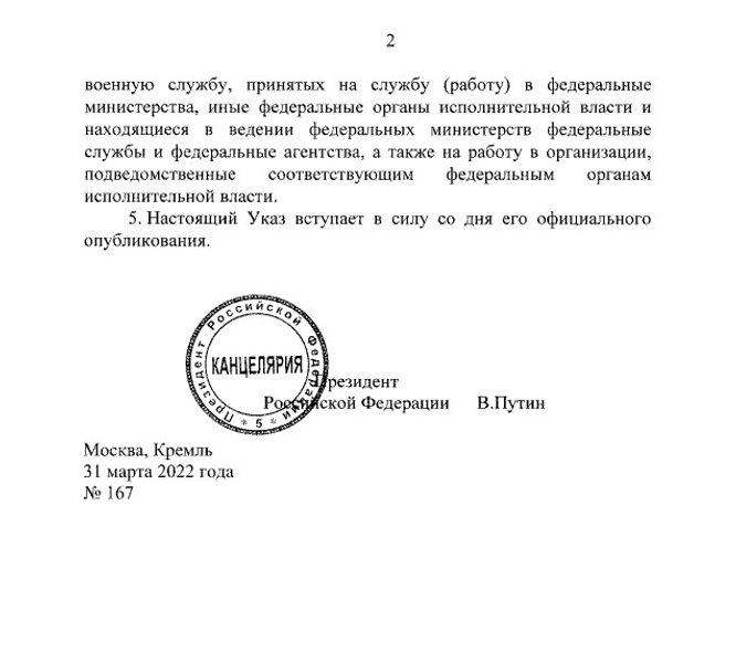 Президент России Владимир Путин подписал указ о призыве на срочную службу в армию с 1 апреля по 15 июля этого года. Документ появился 31 марта на российском портале правовой информации.