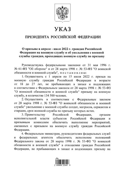 Призыву подлежат 134,5 тыс. россиян в возрасте от 18 до 27 лет, не пребывающих в запасе, говорится в тексте указа.