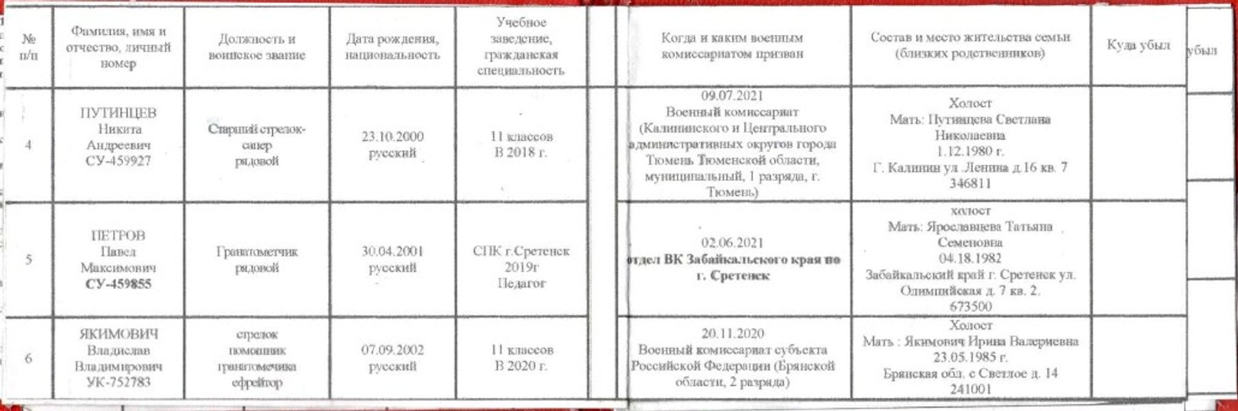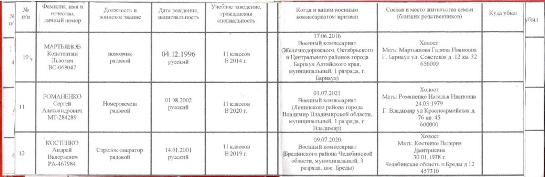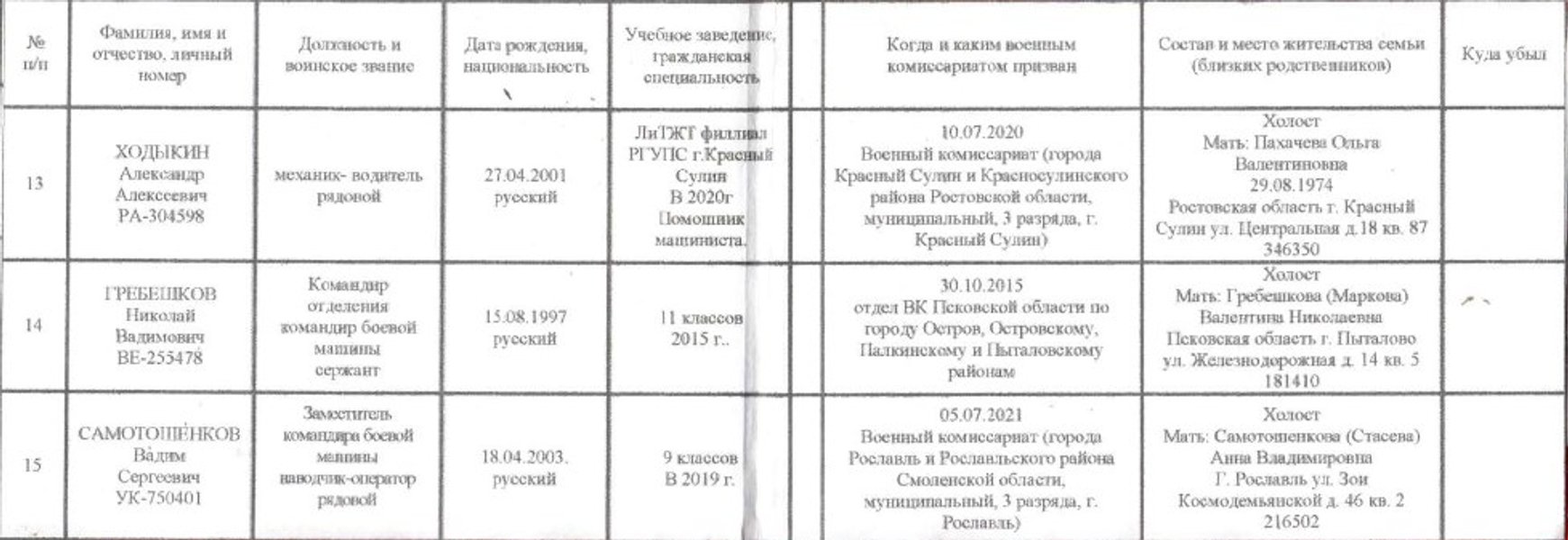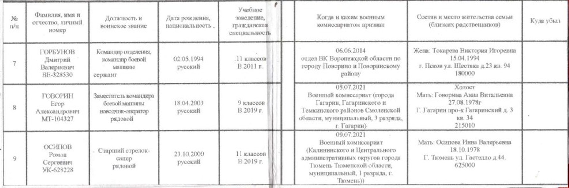 По информации разведчиков, преступления совершили военнослужащие 234-го десантно-штурмового полка из войсковой части 74268. В перечне можно увидеть инициалы и даты рождения оккупантов, должность и воинское звание, а также место жительства их семей.