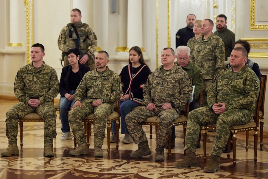 Зеленский вручил ордена "Золотая Звезда" военнослужащим ВСУ, которым присвоено звание Героя Украины и членам семей защитников, удостоенных этого звания посмертно. Церемония награждения прошла в Белом зале Героев Украины в Мариинском дворце в Киеве.
