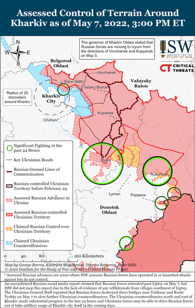Данные о разрушении мостов Циркунах и Русских Тишках, которые находятся рядом с Харьковом, аналитики взяли из сообщений Генштаба ВСУ. Но, как сказано в отчете ISW, эксперты не могут независимо подтвердить, что российские войска разрушили эти мосты и отступили, хотя российские войска разрушили несколько мостов во время вывода войск из Черниговской области и, вероятно, делают это вокруг Харькова.