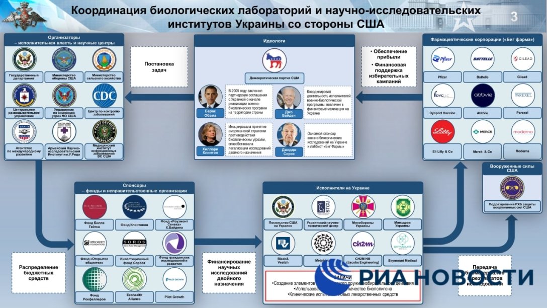 Минобороны РФ также рассказали, что якобы под государственные гарантии привлекались средства организаций, подконтрольных руководству Демократической партии, включая фонды Клинтонов, Рокфеллеров, Сороса, Байдена.