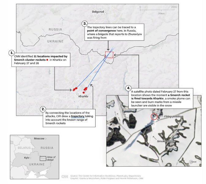 Журналисты отследили запуски 11 ракет "Смерч" по Харькову в период с 27 по 28 февраля. Обстрелы вела 79-я российская реактивная артбригада в Белгородской области России. Военные подчиняются руководству Западного военного округа РФ, отметили авторы материала.