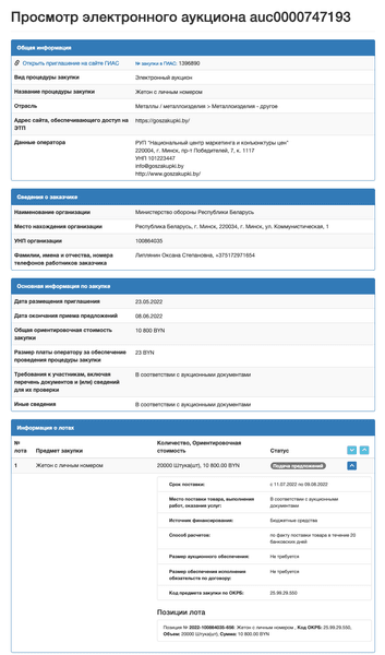 В Беларуси на сайте госзакупок появился тендер на покупку 20 тысяч жетонов для военнослужащих, который проводит Министерство обороны. Соответствующую информацию уже убрали с портала, однако сохранился кэш страницы.