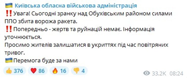 На этом атаки не прекратились, и через два часа после информации об ударах по Киеву появились данные о том, что в Обуховском районе была сбита крылатая ракета. О жертвах и разрушениях не сообщается.