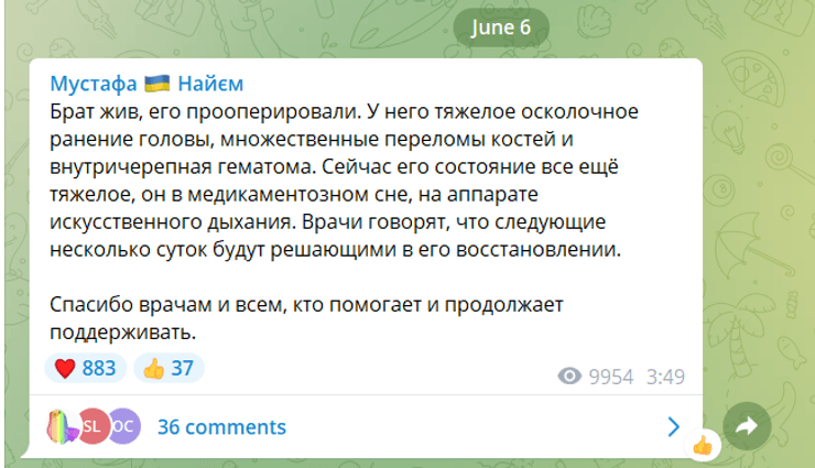 Заместитель министра инфраструктуры Мустафа Найем рассказал о состоянии своего раненого брата — адвоката Маси Найема на войне. По его словам, Маси жив, его прооперировали, однако состояние тяжелое. Об этом Мустафа Найем написал на своей странице в Telegram.