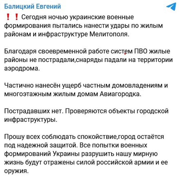 В своем Telegram-канале так называемый "глава Запорожской области", назначенный российскими оккупантами, Евгений Балицкий, сообщил о том, что была попытка ВСУ нанести ракетные удары по жилым районам Мелитополя.