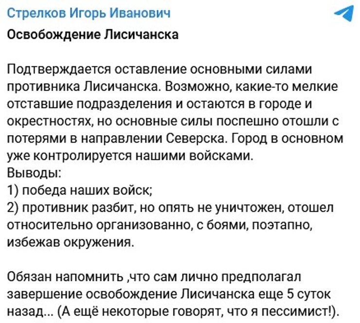 О взятии Лисичанска под контроль российских войск также написал в своем Telegram-канале бывший так называемый "глава Минобороны ДНР" Игорь Гиркин (Стрелков).