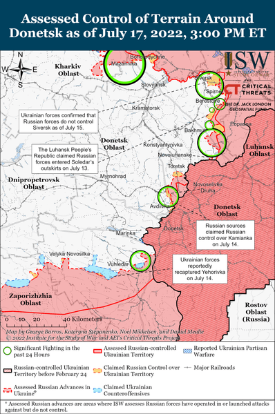По оценкам ISW, российские войска в Украине продолжают возвращаться к боевым действиям после оперативной паузы: ограниченное наземные атаки в Донецкой области продолжились. Представляется маловероятным, что после паузы начнется новая волна крупномасштабных наступлений со стороны РФ, хотя министр обороны Сергей Шойгу распорядился именно об этом. ВС РФ укрепляют защитные позиции на севере Харькова и вдоль южной оси, в приоритете также наступление в районе Северска и Бахмута.