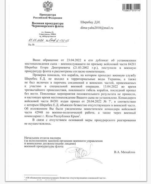 "Шкребец Егор Дмитриевич, матрос срочной службы по призыву, старший вестовой службы снабжения, официально признанный Генеральным штабом участником боевых действий в составе экипажа крейсера "Москва", — погиб. Теперь и документально", — отметил Шкребец.