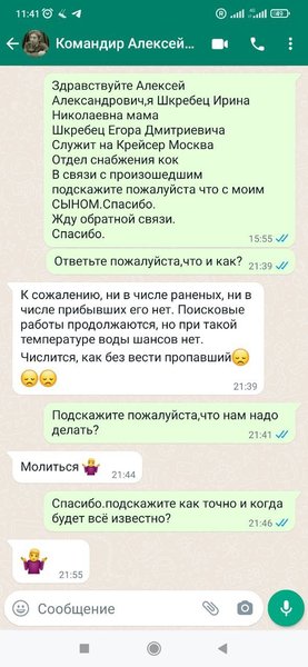 Вскоре после гибели крейсера мать Егора Шкребца заявила журналистам, что российские военные и представители ФСБ не дали никакой информации о погибших.