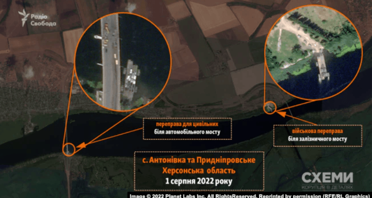 Согласно спутниковым снимкам, паромная переправа для военной техники впервые появилась 1 августа. Она находится в районе поселка Приднепровское Херсонской области. На кадре видно, что на переправе находится 6 единиц техники, еще 4 — на берегу.