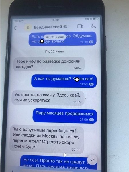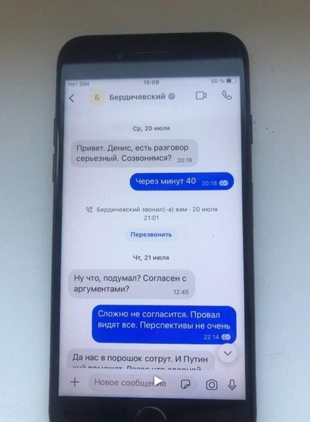 Фотографии, на которых запечатлена переписка с телефона так называемого "главы ДНР" Дениса Пушилина с "депутатом" псевдореспублики Владиславом Бердичевским, оказались в распоряжении журналистов "24 канала". Издание сообщило, что получило фото на редакционную почту от мужчины, который представился "добровольцем ДНР". Источники в украинских спецслужбах подтвердили журналистам, что переписка подлинная.